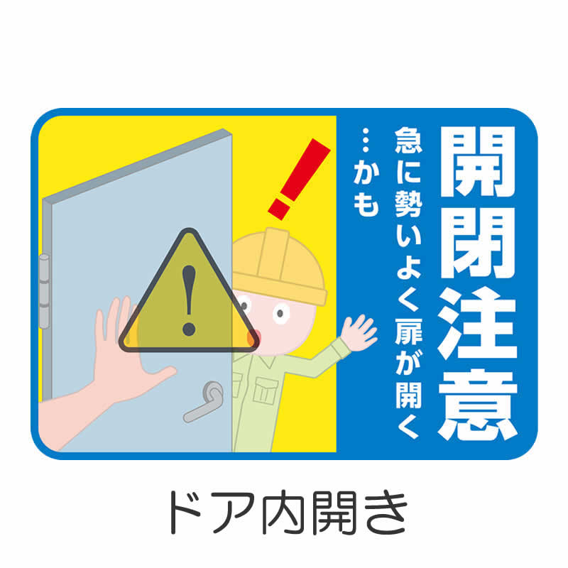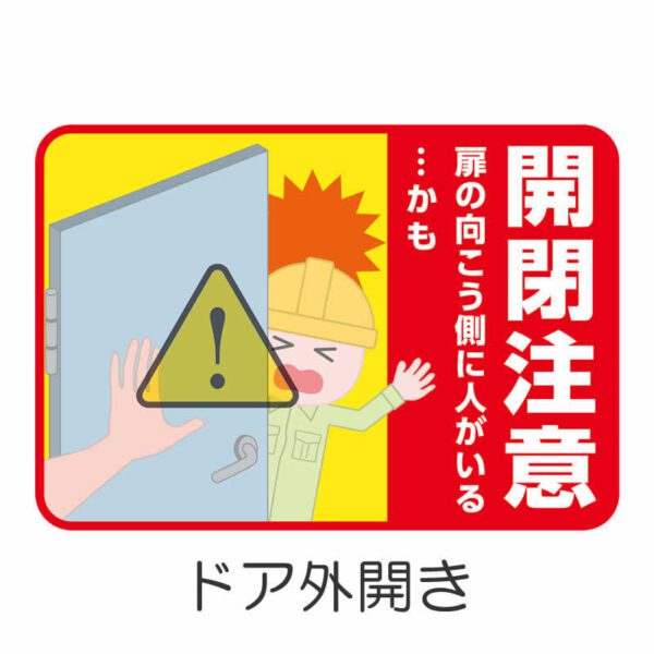 本商品は、窓のない扉でも視認性が落ちないよう、イラストと配色を工夫した「開閉注意」サインです。